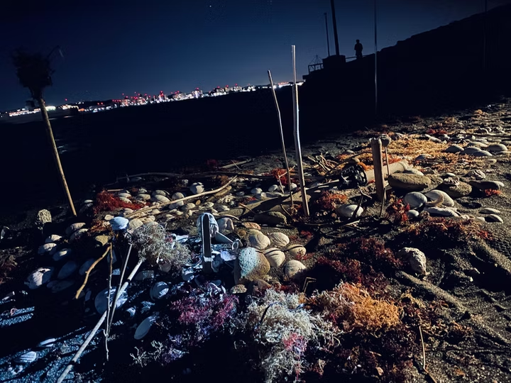 生成と制作のはざまで:海岸 須賀の猿島で開催されたSenseIsland -感覚の島- 暗闇の美術島2022にて、脇坂崇平との共作で、海岸に流れ着いた海藻などの漂流物や石を鑑賞者が移動、分類を行うことにより砂浜にパターンが生成されていく参加型のインスタレーション<生成と制作のはざまで:海岸>を展示した。素材:海岸の漂流物(小石、貝殻、海藻等) 齋藤帆奈脇坂崇平