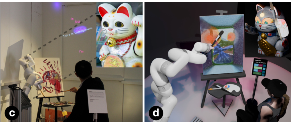 We present INDRA, an Interactive Deep-Dreaming Robotic Artist, designed to assist in real-time, embodied collaboration on a traditional painting canvas. INDRA enhances fine art creation by dynamically adapting to users’ needs, offering support throughout the artistic process. Visually represented as a cybernetic avatar of a mechanical Maneki-neko, the Japanese beckoning cat, INDRA serves as a creative AI companion that paints alongside artists. Its mission is to improve artist-friendly perception of AI among creatives, blending technology with traditional arts to inspire innovation. INDRA integrates robotic painting with advanced AI processes, including speech recognition, computer vision, and generative image synthesis to facilitate co-creation. INDRA differs from existing AI art generators and art robots in its turn-based framework, where user and robot actively share the same canvas.